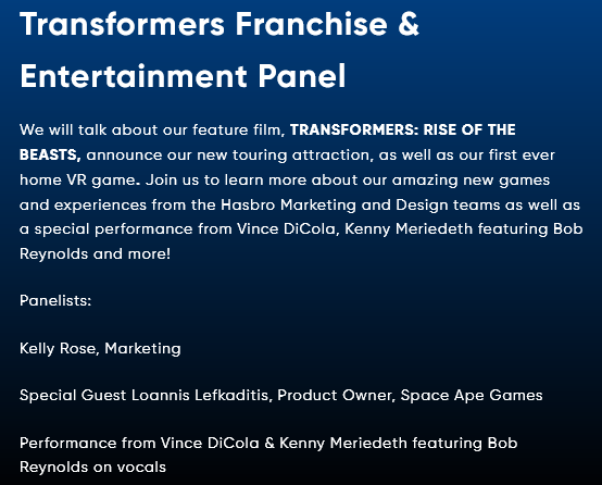 All the events on the original schedule are still taking place, with some adjustments to their starting times. It is interesting that both days now feature ten events each, while the original schedule featured nine the first day and ten the second. It is possible the original schedule was erroneous and the Transformers Franchise & Entertainment Panel was always part of the plan.